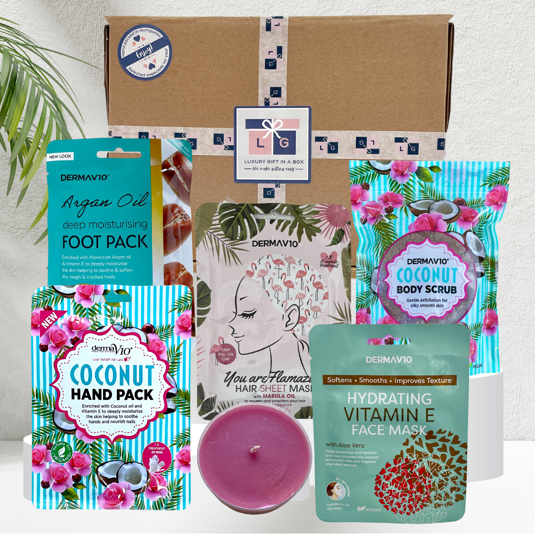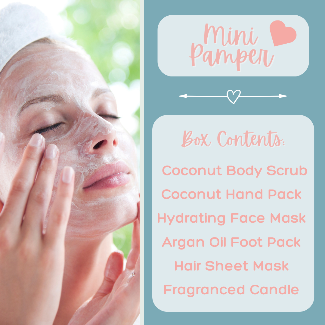 Mini Spa Pamper Box with our most popular spa-at-home treats! It is a great way to treat yourself or a loved one to some much needed "me-time' all in the comfort of your own home. We also add a gorgeously fragranced candle to set the mood. Beautifully hand packed in shredded tissue paper in a recyclable box, with a ribbon all ready for gifting.