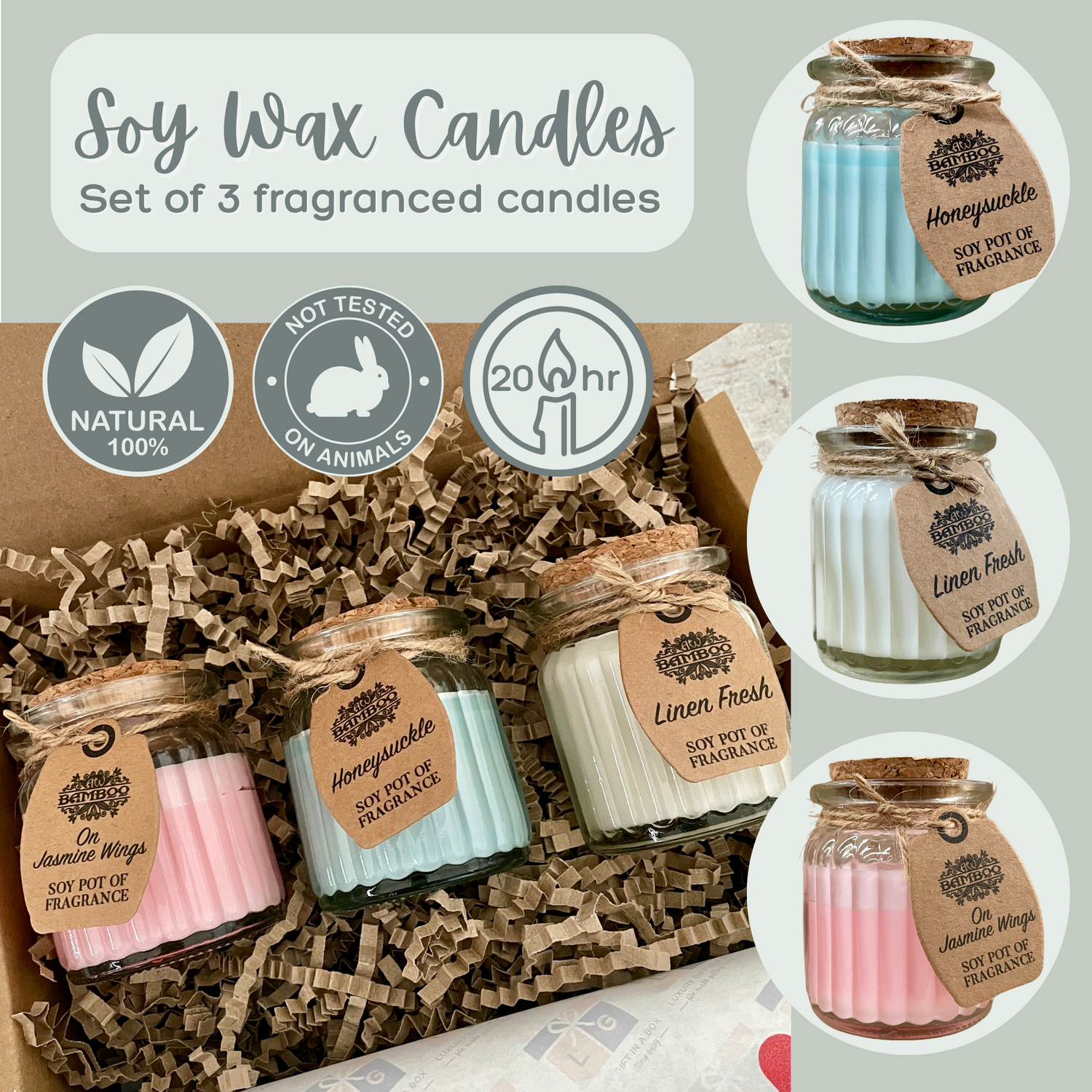 These three gloriously scented soy wax candles are presented in a ribbed glass jar with cork lid. They have an approximately 20hr burn time and are made from 100% natural ingredients and are cruelty free. Packed in a gift box with tissue paper, they are all ready for gifting.