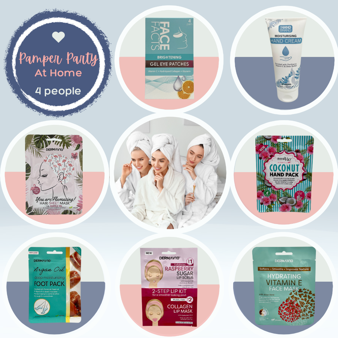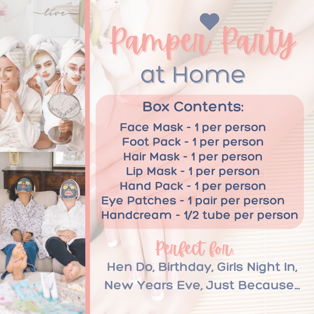 You’ll receive a box filled with fabulous pamper treatments that you can enjoy along with your friends, all in one box. The pamper treats are from head to toe and all you’ll need to do is put on your favourite music, put out a few nibbles (sweet and savoury), have a bottle of something chilled in the fridge and get ready to enjoy a relaxing pamper and have a laugh and some fun with your friends.